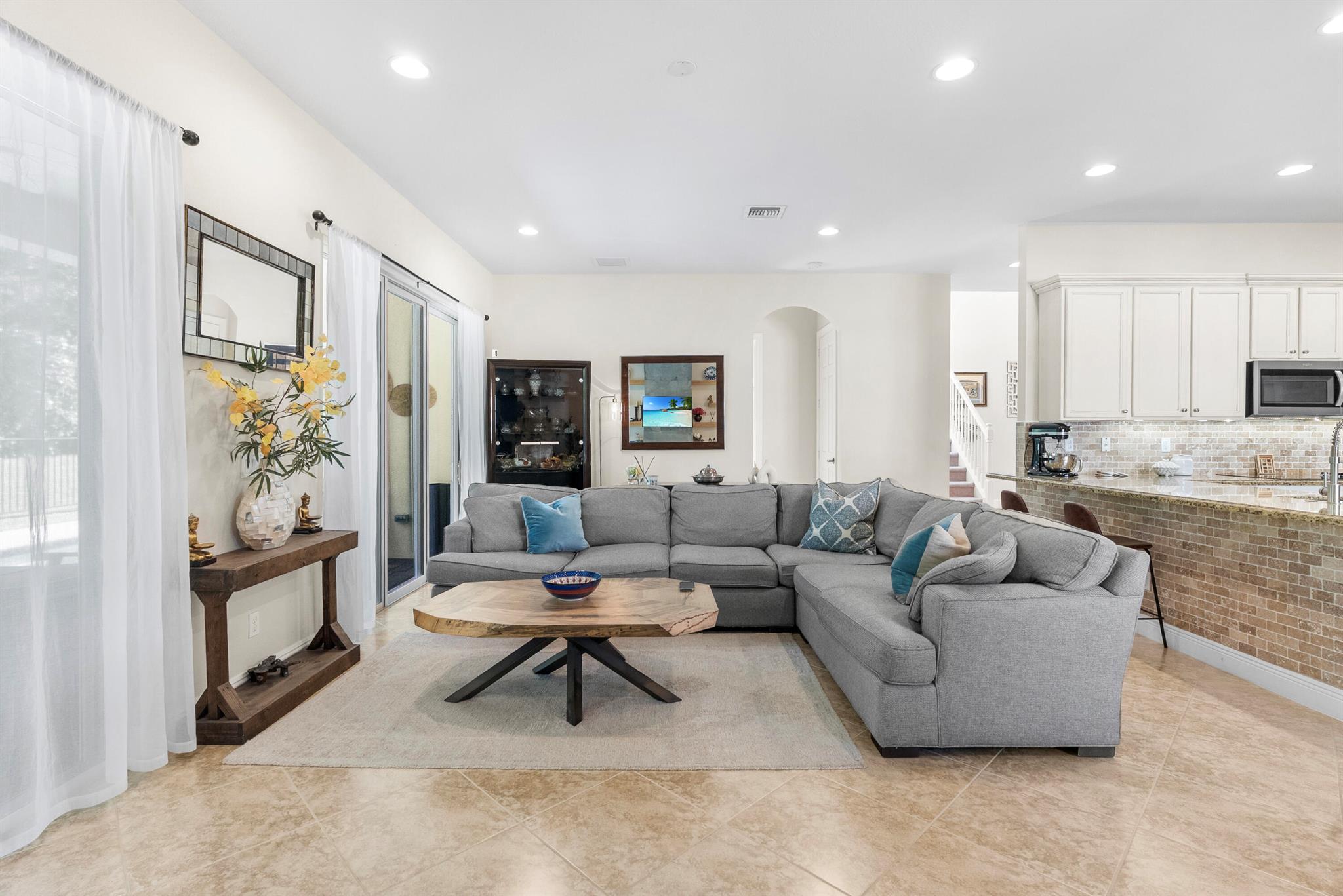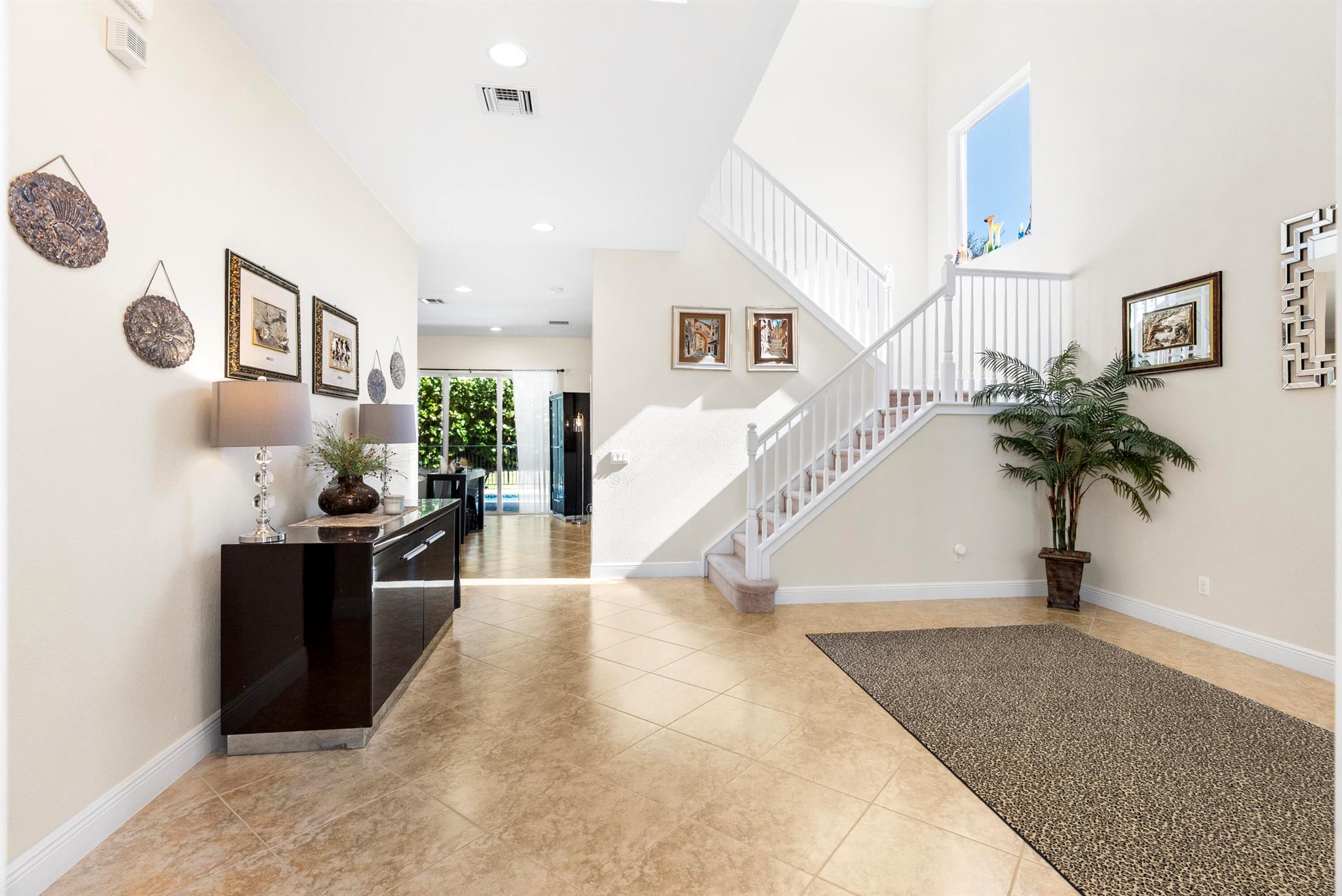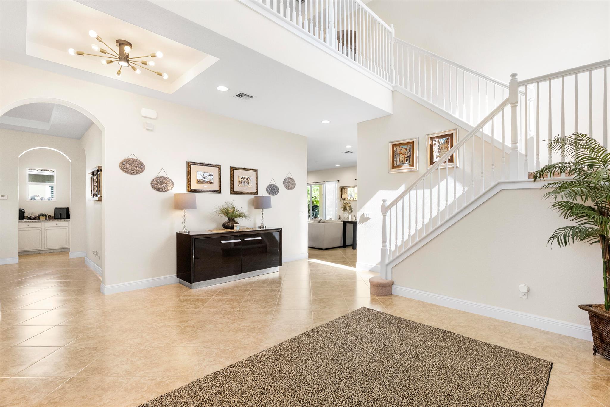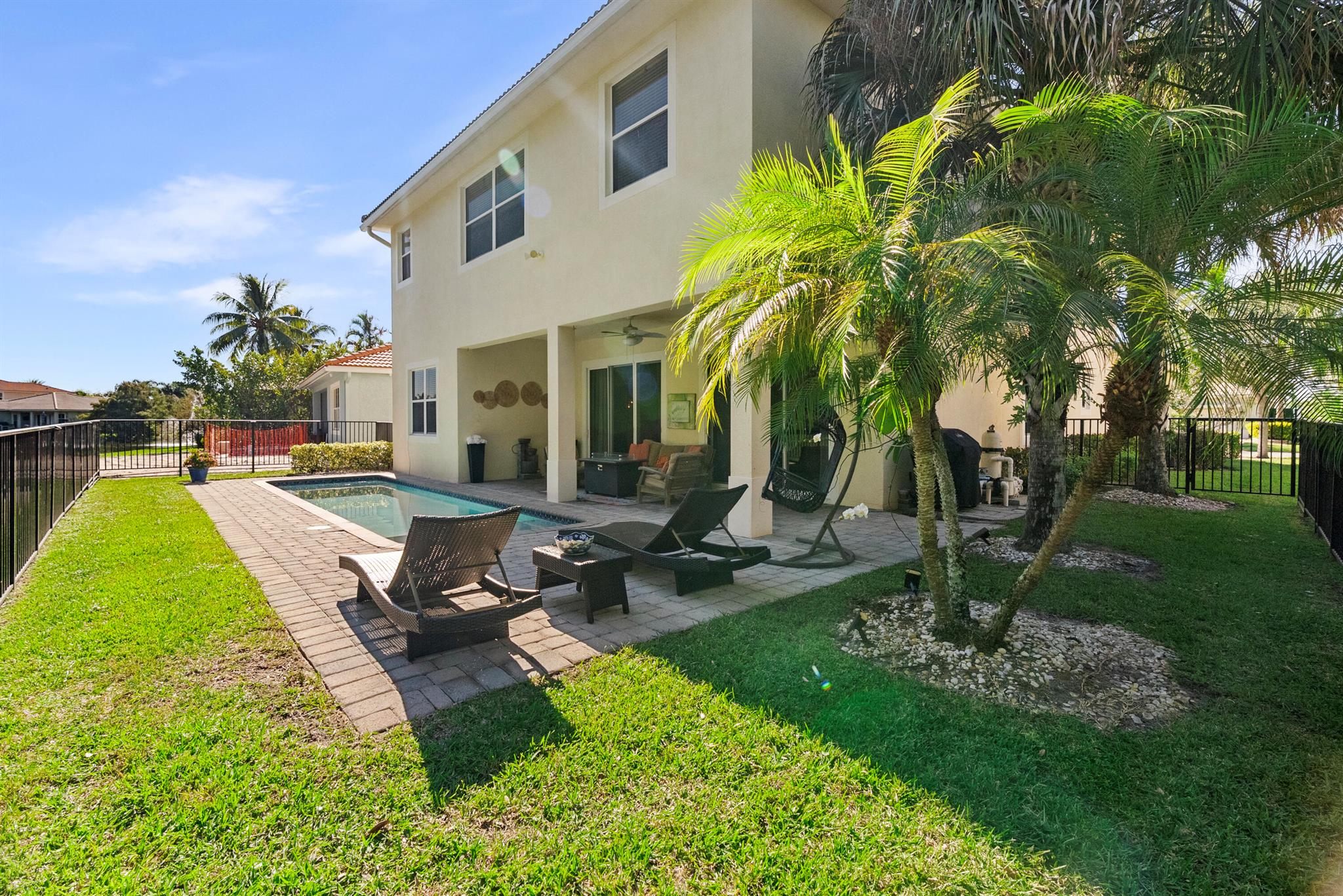 Introducing an exceptional new offering in the heart of Palm Beach Gardens. Situated within the prestigious gated community of Paloma at the Gardens, this beautifully upgraded 5-bedroom, 4-bath pool home delivers sophisticated style, effortless comfort, and undeniable value.A grand living room with soaring ceilings sets the tone upon entry, guiding you into an inviting family room and open kitchen designed for both connection and comfort. Sliding glass doors frame the serene private pool, creating a seamless indoor-outdoor living experience. The family room is highlighted by a custom-designed wall unit with a multi-color feature fireplace, while the renovated open kitchen showcases modern cabinetry, sleek finishes, and newer appliances.Each bathroom has been thoughtfully upd