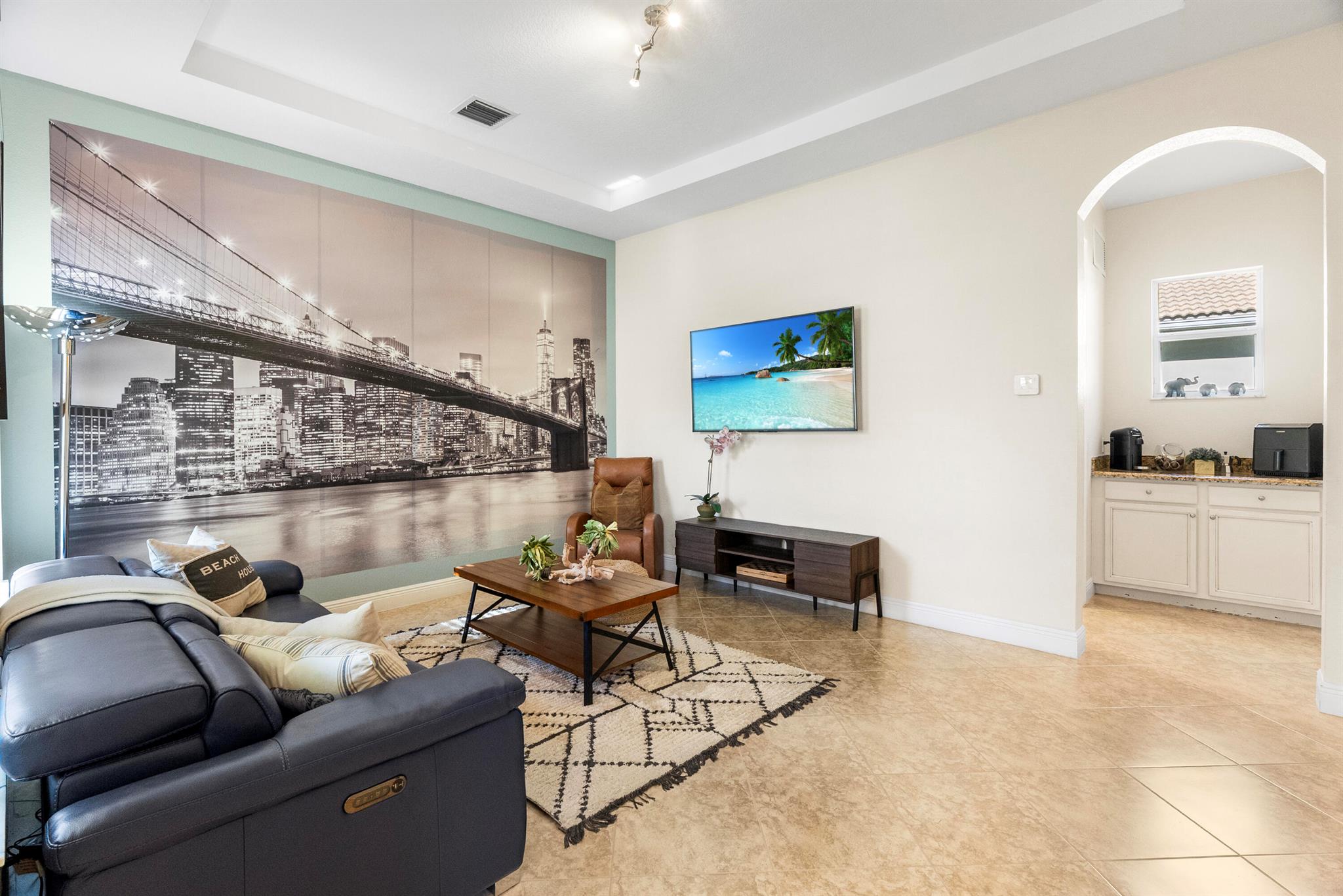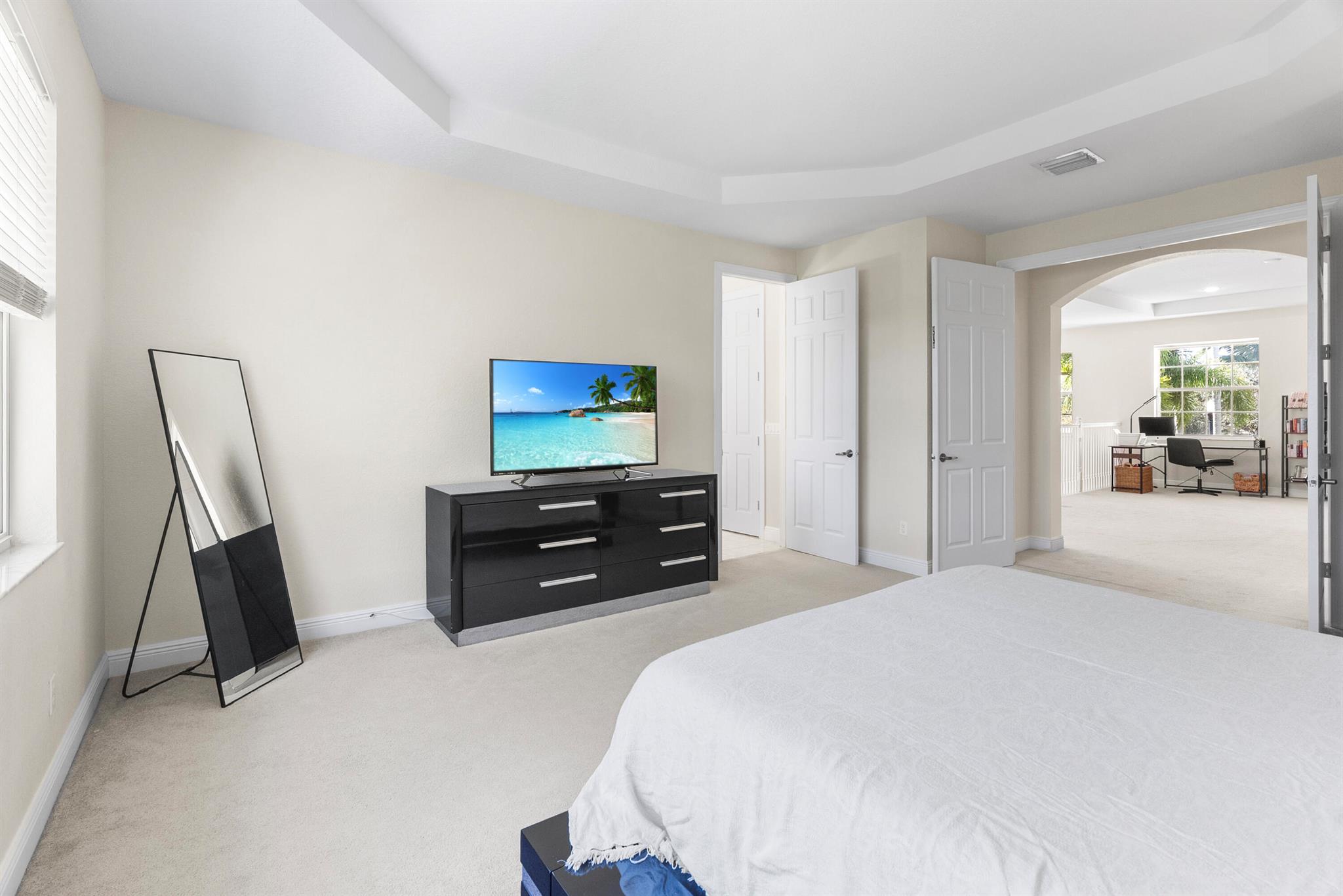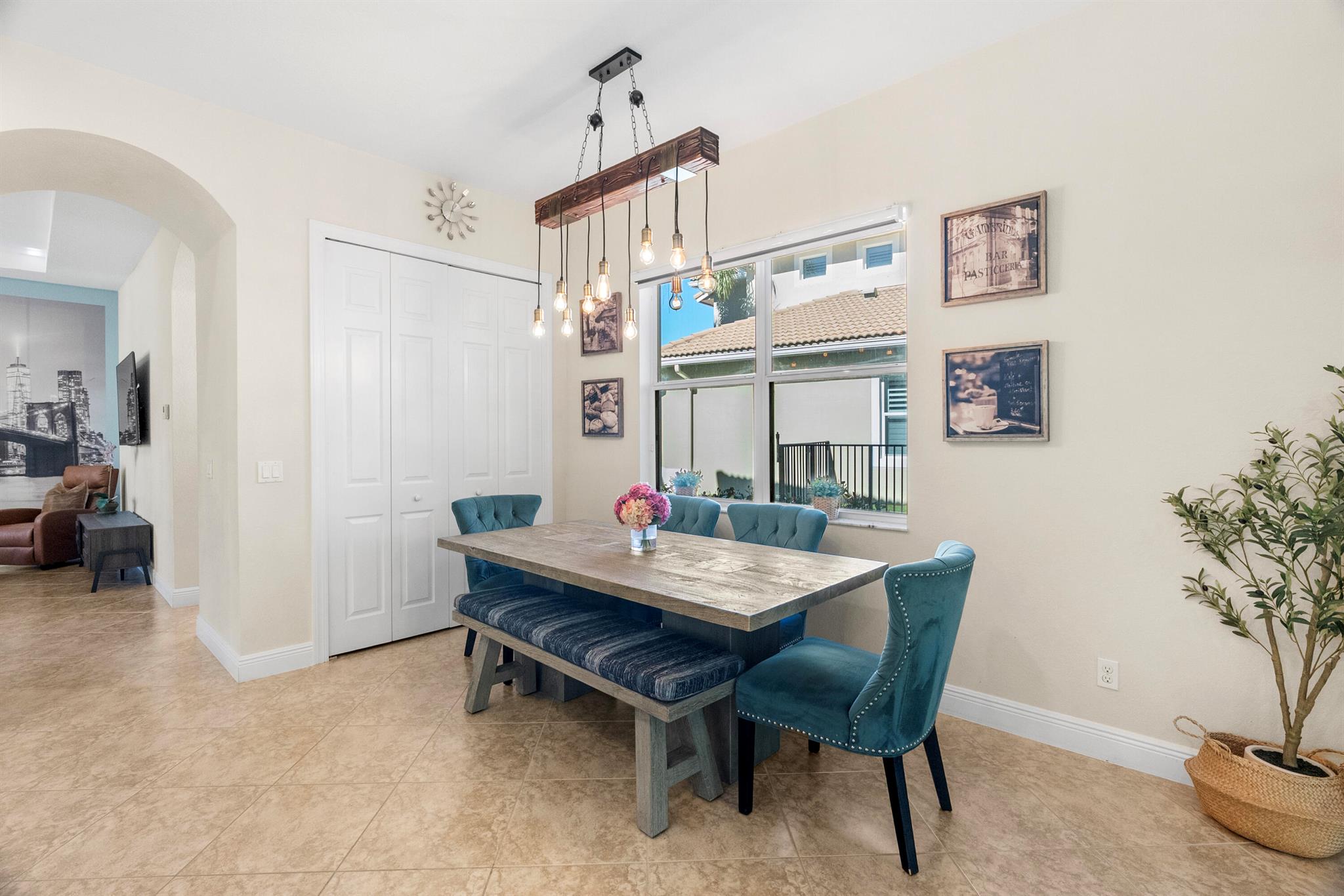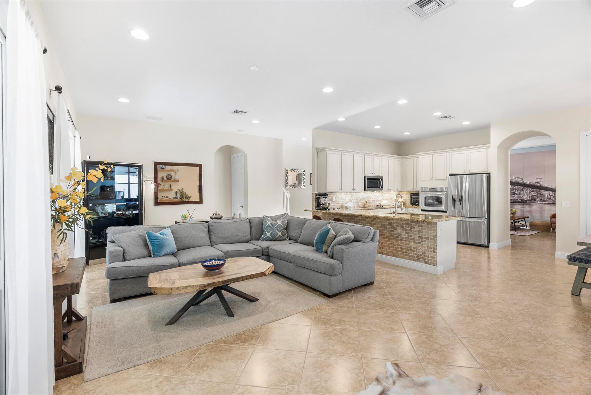 Introducing an exceptional new offering in the heart of Palm Beach Gardens. Situated within the prestigious gated community of Paloma at the Gardens, this beautifully upgraded 5-bedroom, 4-bath pool home delivers sophisticated style, effortless comfort, and undeniable value.A grand living room with soaring ceilings sets the tone upon entry, guiding you into an inviting family room and open kitchen designed for both connection and comfort. Sliding glass doors frame the serene private pool, creating a seamless indoor-outdoor living experience. The family room is highlighted by a custom-designed wall unit with a multi-color feature fireplace, while the renovated open kitchen showcases modern cabinetry, sleek finishes, and newer appliances.Each bathroom has been thoughtfully upd
