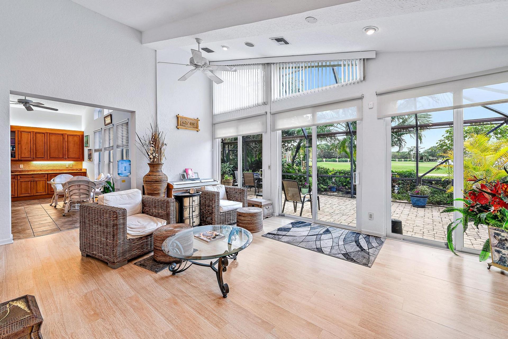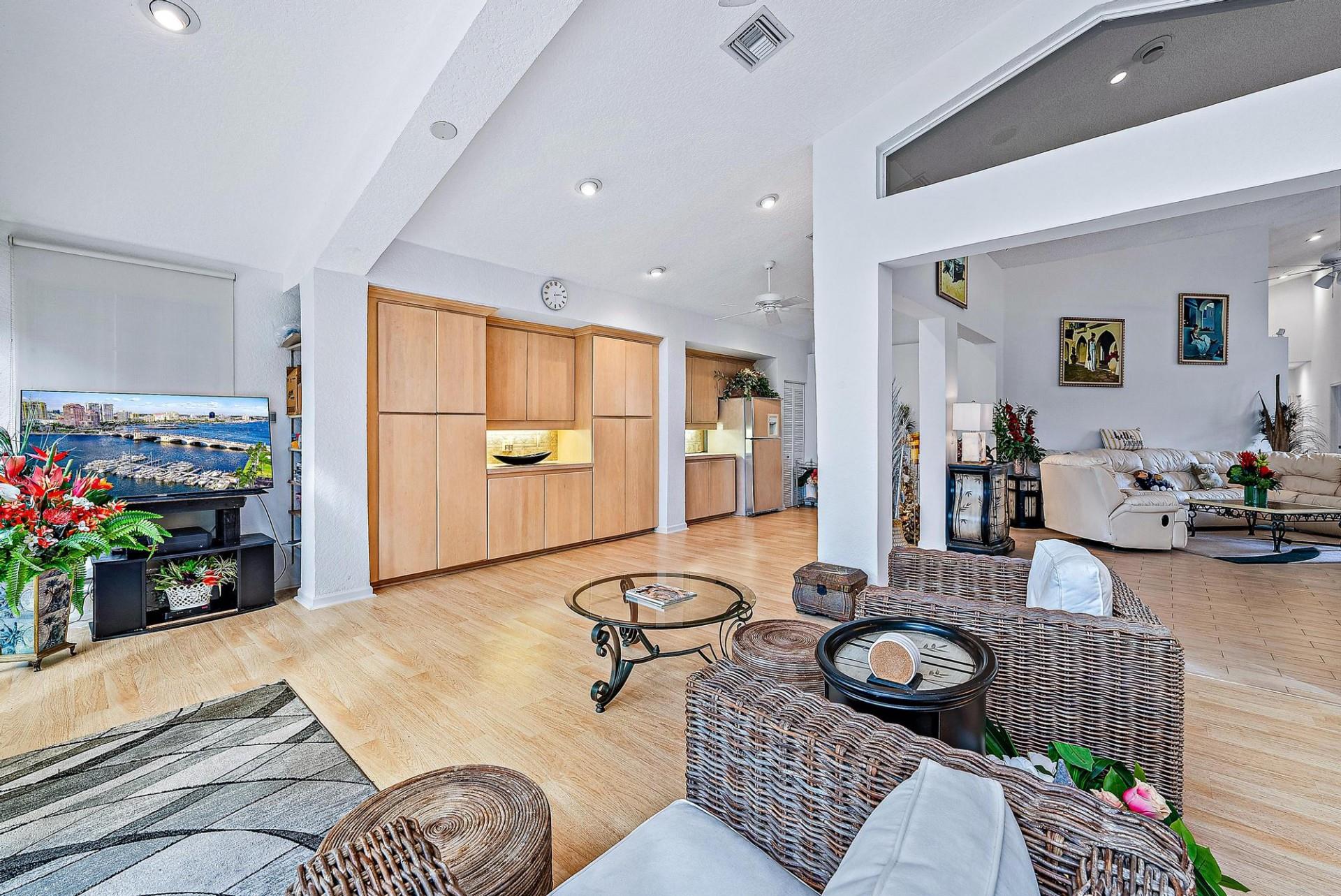 This charming CBS home completely furn. has 3 oversized bdrms/3 full baths directly on golf course overlooking lake and sunsets. Soaring volume ceilings add bright sunlight boasting 2 kitchens w/hurricane impact sliders, wall-wall cabinets thruout including garage. Wood floor in T.V. room, recessed hallway lights, kitchen plumbing, garbage disposal, kitchen cascading drop lights, and fan in 2021. Porcelain floor/easy cleaning. Large master bdrm has 3 closets/shoe storage and Calif. closet. Dual sinks in rich cherry wood cabinets, linen close/private water closet off master. Spacious 2nd bdrm./2 closets and private bathrm. Two A/C units/metal roof. Brick paved screen in patio w/shades over-look private pond w/waterfall. Accordion storm shutters. Freshly painted white. Immaculate.